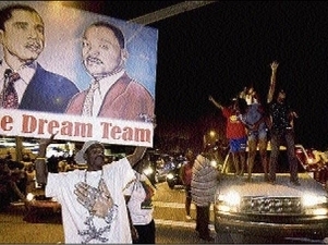 People celebrate the victory of President-elect Barack Obama in the early morning hours last Wednesday in the Little Haiti neighbourhood of Miami. - AP